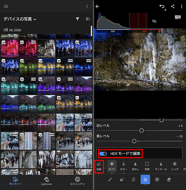 あとはAdobe Lightroomで転送されたRAWデータを開き、「HDRモードで編集」のスイッチを入れて「自動」とすれば、ダイナミックレンジの広いRAWデータから、Ultra HDRフォトが生成できます。