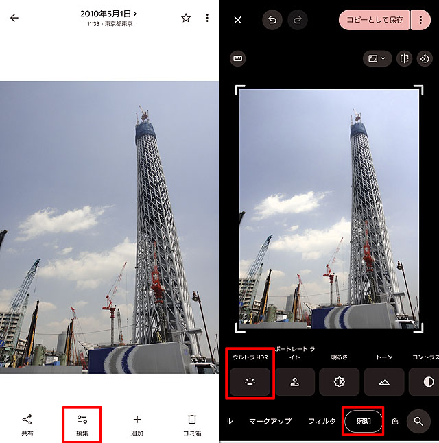 現在はGoogle フォトの編集機能に「ウルトラHDR」という項目があり、これを使うと、昔撮影したSDRの写真もUltra HDRにしてくれます。