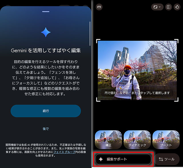 順次、各モデルで利用ができるようになるということだったのですが、今朝、確認したところ、手元の「Xperia 1 VII」でGoogle フォトの編集機能を利用したら「編集サポート」という見慣れない項目が表示されていて、これをタップしたところ「Geminiを活用してすばやく編集」という案内がでました。