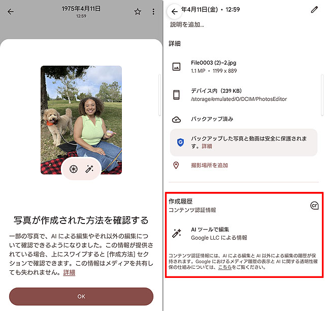 なお、こうしてAIを使って生成した写真には「作成履歴」として写真データに記録が残るようで、写真のデータを見ると、こうして「AIツールで編集」という作成履歴が残るようになっています。