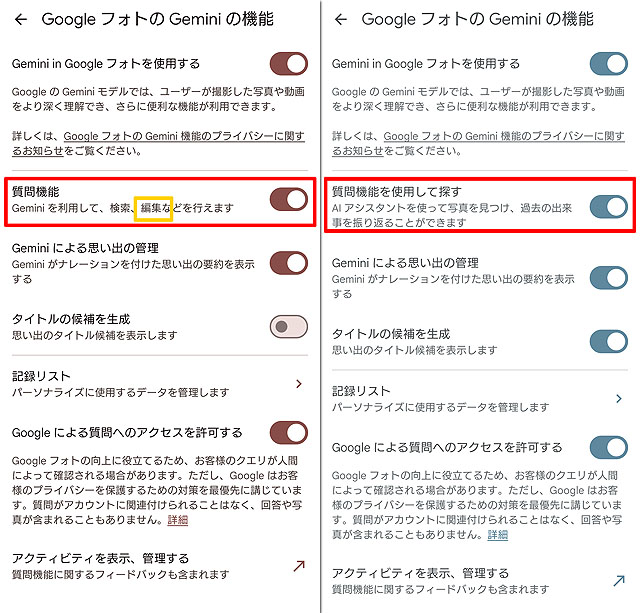 画面左はXperia 1 VIIで最新アップデートされたときのGoogleフォトのGemini機能の設定画面です。「質問機能」のところの表示が微妙に変わっていて、画面右のアップデート前のXperia 1 VIとは表示項目が違っています。