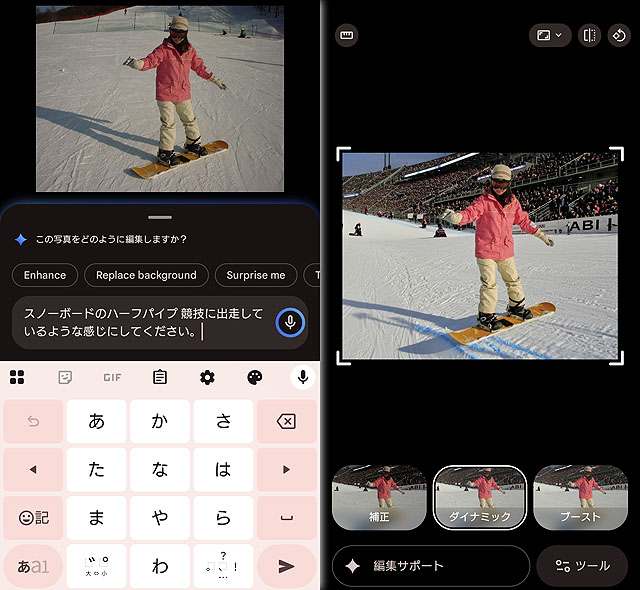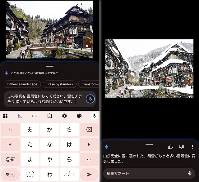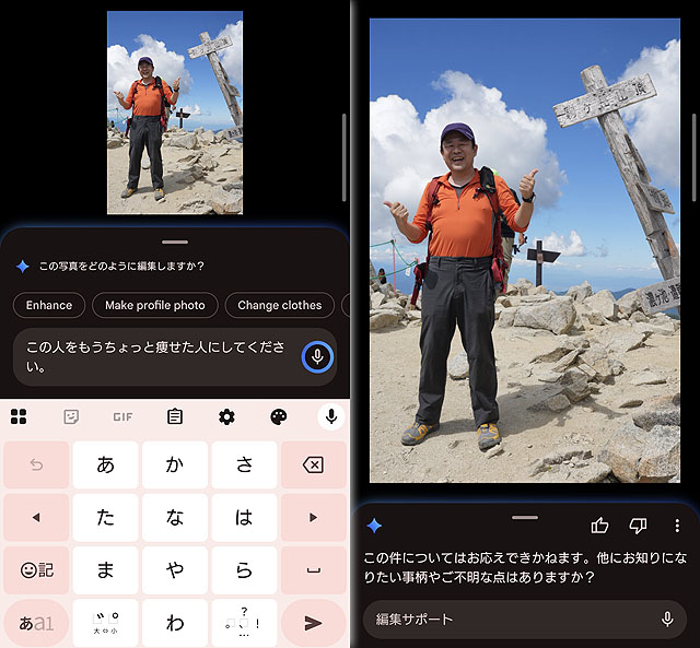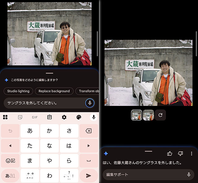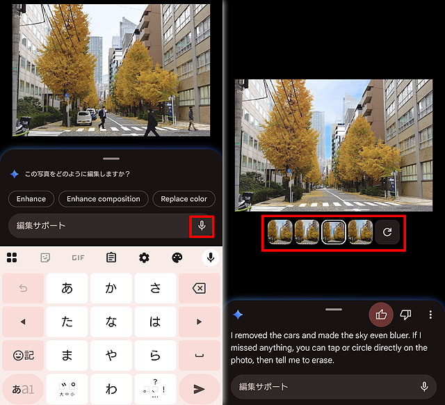 さて、使い方に関しては非常に簡単で、写真編集に入って「編集サポート」を選択し、あとはマイクアイコンをタップして、どうしたいのか話すだけ(もしくは文字入力で指定をします)