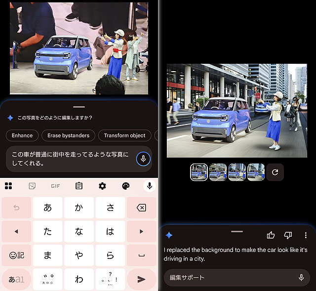 生成AIなので、かなり自由度の高い編集もできます。これは東京モビリティショーの時に撮影したステージにある車ですが、これを街中走行の写真にしてもらうこともできます。