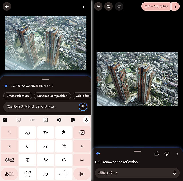 この場合は、人と車を消して空を青空にしてほしい、というリクエストをしました。すると画面右の状態の画像を出力してくれて、コピーして保存することができる、という仕組みです。