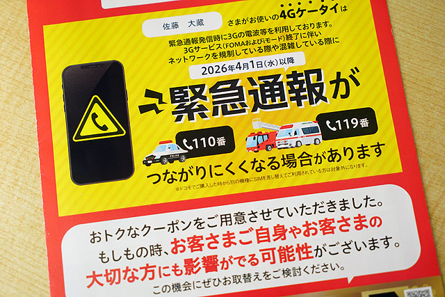 直近では2026年4月1日に3G通信サービスの終了があるため、4Gケータイでは緊急通報がつながりにくくなることがあるという案内がありました。