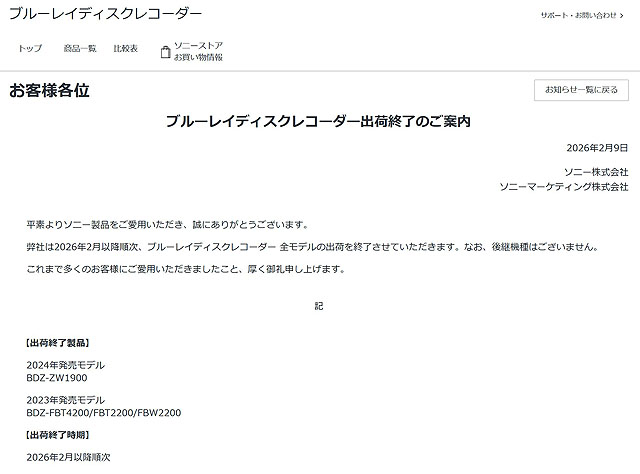 | 2026.2.9 | ブルーレイディスクレコーダー出荷終了のご案内 | 2026年2月以降順次 |