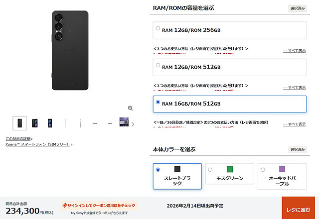 ソニーストアの人気ランキング上位にずっとランクインしている「Xperia 10 VII」も同様に在庫販売に切り替わりました。2月17日入荷予定分が繰り上がっています。一時は全色在庫復活しましたが、現在はチャコールブラックが品切れになり、次回入荷待ちとなっています。