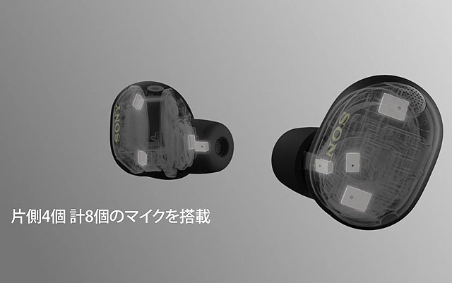まずはノイズキャンセリング用のマイクですが片側に4個、合計8個も搭載しています。内側に2個、外側に2個搭載されています。従来モデルのWF-1000XM5が3個(内側2個、外側1個)だったので、ノイズを打ち消すためのマイクの数がまずは増強されています。