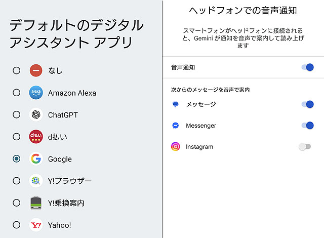 時期的に、Googleアシスタントとかの音声操作機能を利用し始めたときくらいから聞けている気がするので、まずはGoogleのデジタルアシスタントとか、Googleのヘッドホンでの音声通知とかを調べるのですが、これらのLINE通知(メッセージ)の設定とかないんです。