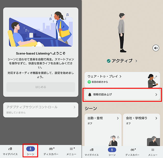 ソニーのヘッドホンコントロールアプリ「Sound Connect」には「Scene-based Listening」という機能が搭載されています。音楽の自動再生機能で、ヘッドホンを装着するだけで設定した音楽アプリを再生することができる、というもの。