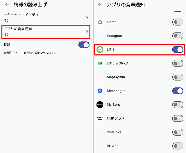 ここで「LINE」をオンにしておくと着信したメッセージをそのまま日本語で誰からの送信でどういうメッセージか読み上げてくれるんです。
