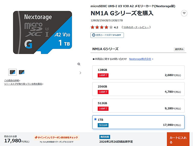 DRAMメモリーの高騰&品不足ですが、いろいろな製品に影響が出ていて、ソニーストアで販売しているNextorageのmicroSDカードも入荷終了になっていました。2月18日までは512GBモデルも販売していたのですが、その後、1TBのみの販売になり、それもついに2月24日朝完売していました。
