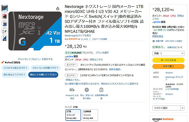 【在庫復活】Nextorage 1TB microSDカードがソニーストアで再入荷!Amazonより1万円以上安い状況