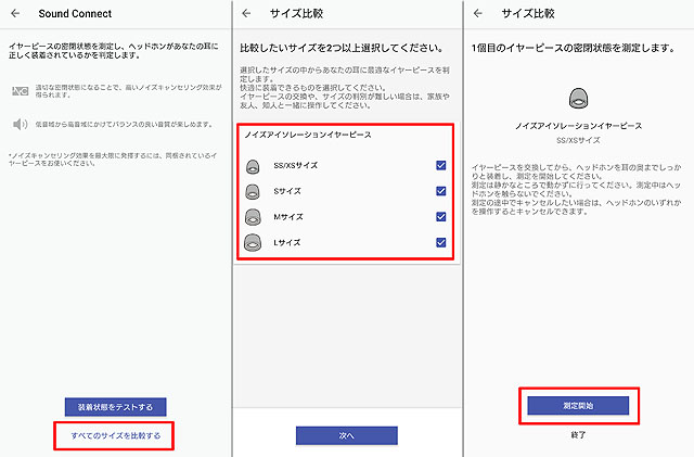 ソニーの専用アプリ「Sound Connect」にはイヤーピースの装着状態をテストする機能が搭載されています。