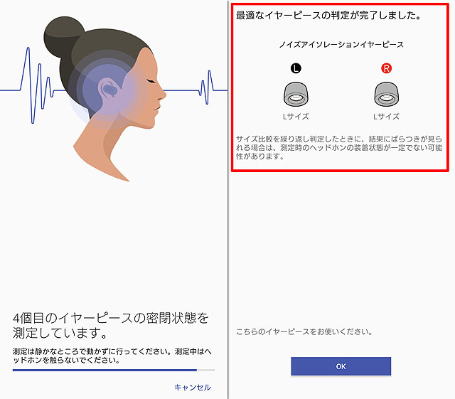 最後にLサイズを試すと、それまででもっとも最適なイヤーピースを表示してくれる、という流れになっています。