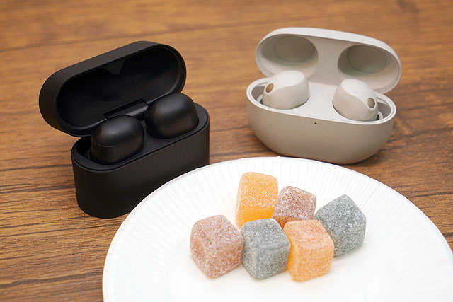 通気構造の採用により、鼓膜とイヤホンの間の空間で起こる反響を低減したというWF-1000XM6。咀嚼音が軽減されるという話で、グミなどを食べてみると効果がわかるというので、グミを食べながらWF-1000XM5とWF-1000XM6の音を比較してみました。