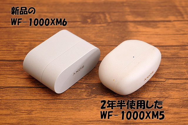 写真ではわかりにくいのですが、新品のWF-1000XM6と2年半使ってきたWF-1000XM5の比較です。WF-1000XM5にはシリコンケースを装着して使っていたのですが、シリコンとケースの間に汚れが入り込んでしまうみたいで、やはり使用感がそこそこ出てしまっています。