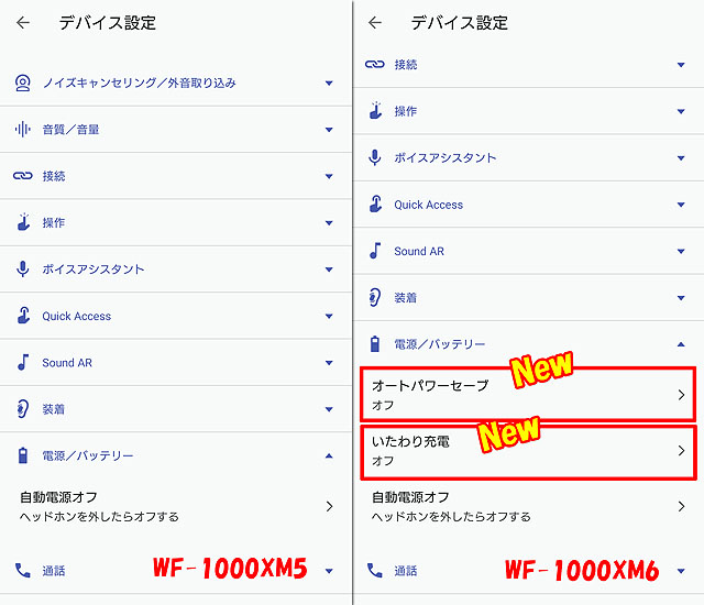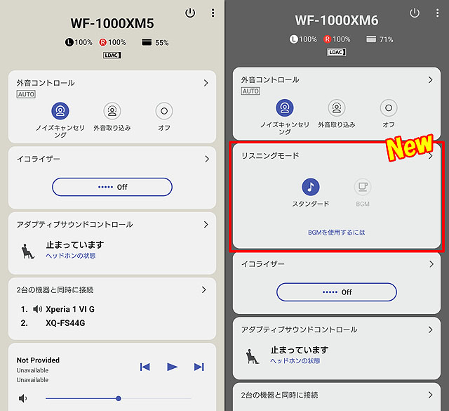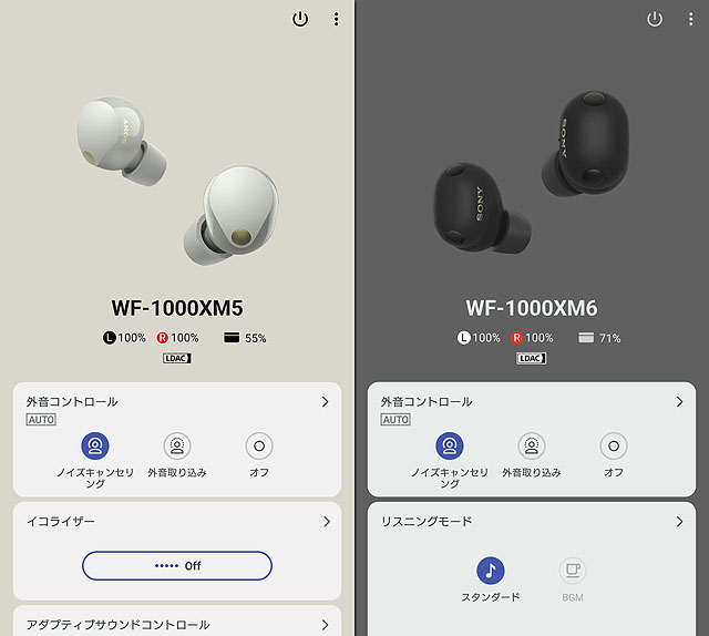 ついに発売日を迎えた「WF-1000XM6」ですが、早速、WF-1000XM5と並べて、アプリの違いを見比べていってみたいと思います。