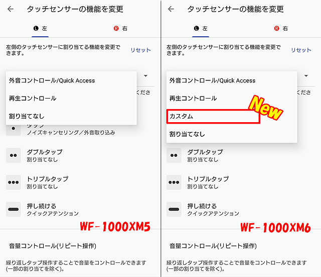 タッチセンサーの機能変更で、従来はプリセットされたものしか利用できなかったものが、カスタムという項目が増えて、自分の設定を残すことができるようになっています。
