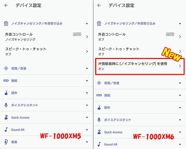 設定画面にたどり着くまでの道のりが違うだけでWF-1000XM5とWF-1000XM6での機能の差はありませんでした。