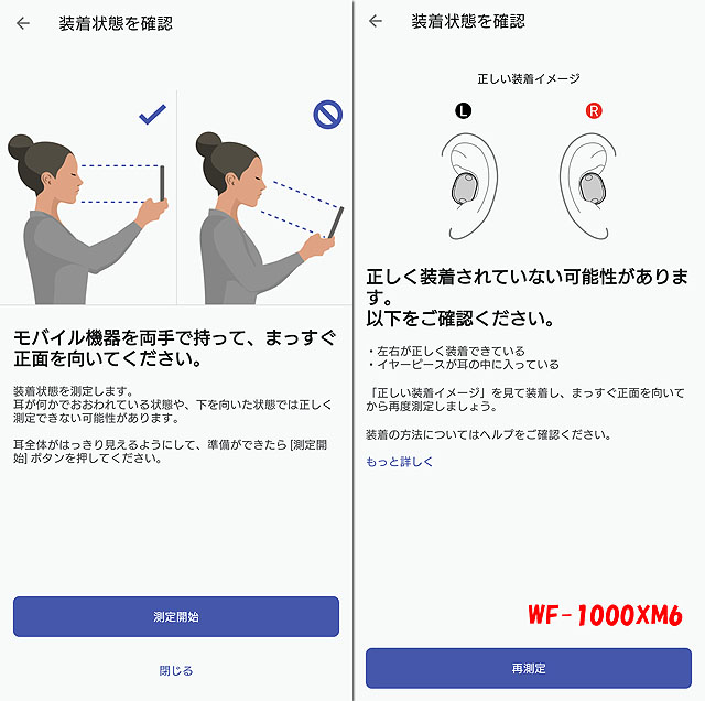 WF-1000XM6で「装着状態を確認」とすると、ご覧のようにスマートフォンを手にもって、ポーズをとることになります。で、この時に確認しているのは装着しているイヤホンの向きで、わざと片方を逆さまにして装着したところ、ちゃんとエラーが出るようになっていました。