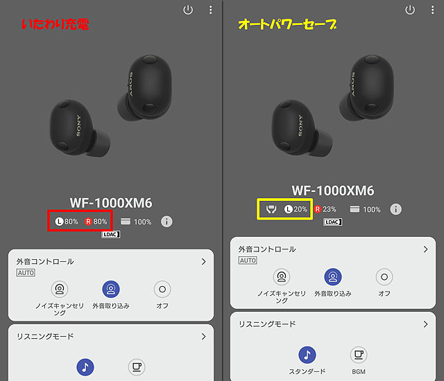 いたわり充電はご覧の通り、80%で充電が止まりますが、ケースは100%まで充電されます。そこからオートパワーセーブをオンにして外音取り込みでLDAC接続にてハイレゾ楽曲の再生を続けたところ、4時間半で20%になり、そこからあと1時間再生してバッテリーが切れました。80%充電でも合計5時間半の再生ができました。