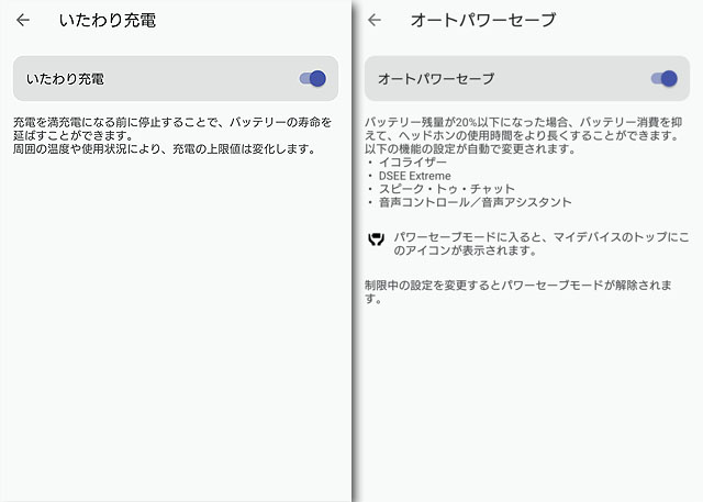 電源設定の中に「オートパワーセーブ」と「いたわり充電」というものも加わりました。オンにして使ってみると、いたわり充電はケースではなくてヘッドホン本体を80%までの充電でセーブする、という機能になっています。