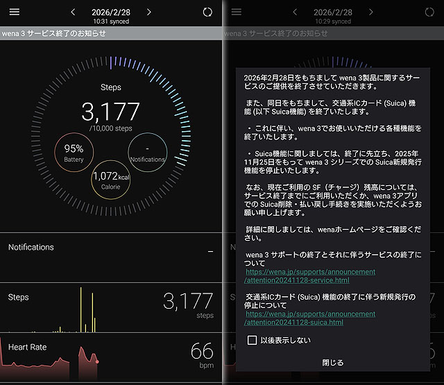 そして、wena 3の機能についてですが、こちらも公式発表がなく、明日以降、アプリ機能を利用できるかどうかも不明となっています。機能がすべて使えなくなるという発表はないのですが、利用できるという情報も公開されていないので、3月1日になってみないと状況がどうなるのかはわかりません。