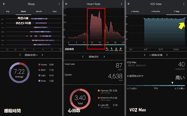VO2 Maxというのは、最大酸素摂取量で、その人の運動機能を数値化したものになります。2月だけ少し数値が上がっていて、トレーニングの成果が出ているようです。これなら、明日の完走も大丈夫かな?