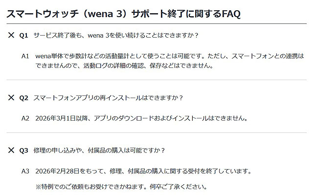 2月28日でサービスとサポートが終了した「wena 3」ですが、天気予報などのWEB連携サービスが使えなくなってしまったものの、通知や歩数計などの単独で動作する機能については、3月1日以降も利用ができているようです。