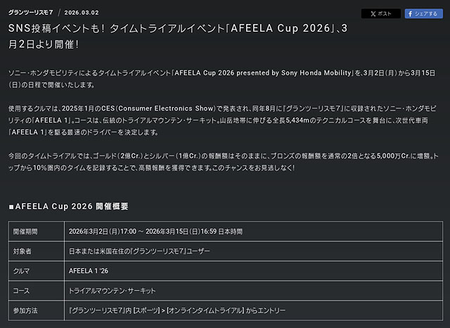PlayStationのゲームタイトル「グランツーリスモ7」にて「AFEELA Cup 2026 presented by Sony Honda Mobility」が開催されています。 ソニー・ホンダモビリティの企画でゲ […]