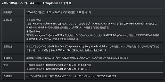 SNS投稿イベントというのも開催されています。こちらは日本時間の3月15日16時59分までとなっていて、PlayStation 5、PlayStation 4のゲーム内にて撮影した「AFEELA 1」の画像をXまたはInstagramで投稿して参加します。