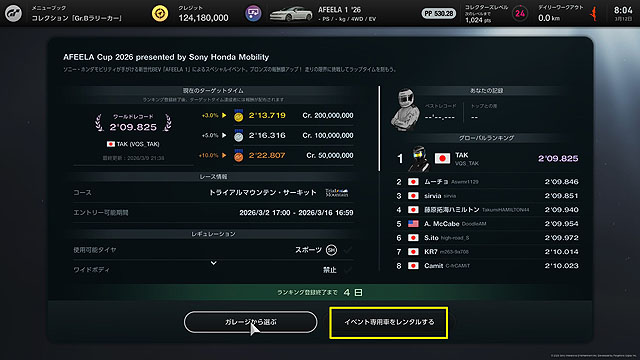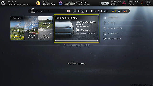 GT7で「AFEELA Cup 2026」開催 5000万Crがもらえるタイムアタックイベントに参加してみました