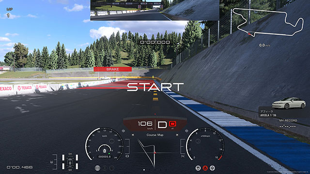 いざ、出陣! 私はグランツーリスモ歴こそ長いものの、ほぼ初心者ドライバーなので、各種アシストは全部使って走行。コースアウトしたり壁に接触すると正式タイムにはならないので、まずはコースアウトしないようにして安全走行を心がけてタイムアタック。