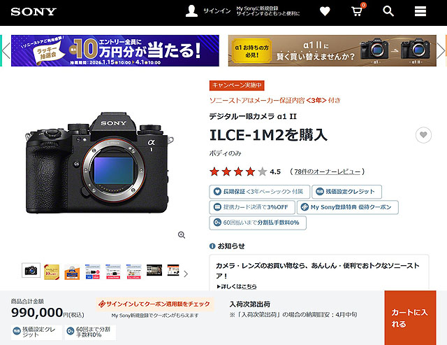 ソニーストアにてデジタル一眼カメラのフラッグシップモデル「α1 II」の納期が「入荷次第出荷」の表示となり、ストアの納期目安としては4月中旬ごろの案内になっています。