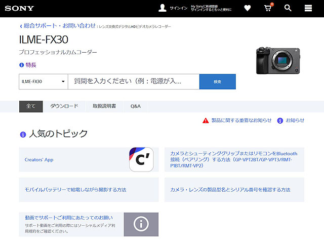 こちらが当店店頭でも展示している「FX30」のサポートページトップになります。