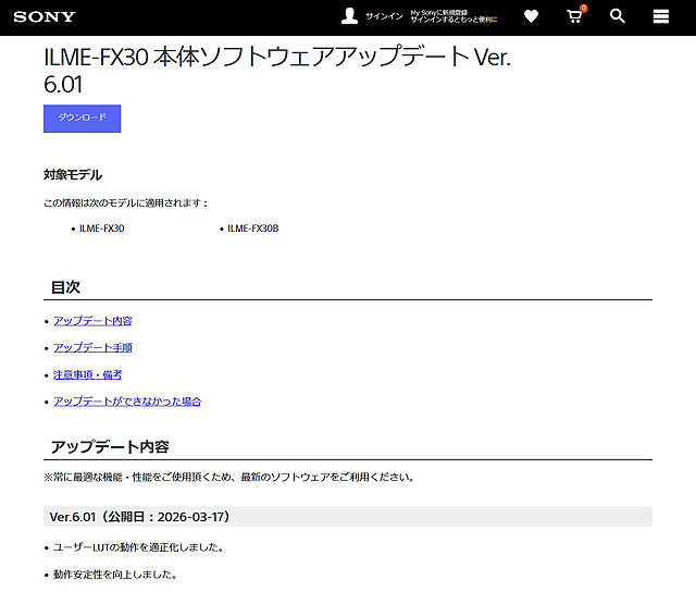 Cinema Line CameraのFX3 / FX3A / FX30に最新アップデートが公開。LUT最適化と安定性向上が主な内容です。