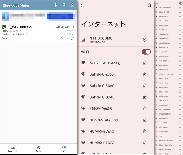 Bluetoothについては私が持ち歩いているもの以外は検出されていませんが、住宅街とはいえ、近くにマンションがあることもありWi-Fiの電波はものすごいことになっています。これでは都内と変わらないくらいなんですけど、マンションから距離はあるので影響はそれほど強くはないはずです。