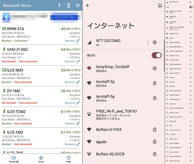 画像左はBluetooth電波をスキャンしたところですが、ソニーショップ店頭ということで、展示しているαがすべてBluetoothを使っているし、VAIOやAVアンプ、BRAVIA、Walkman、PlayStationと、無数のBluetooth信号が飛んでいます。