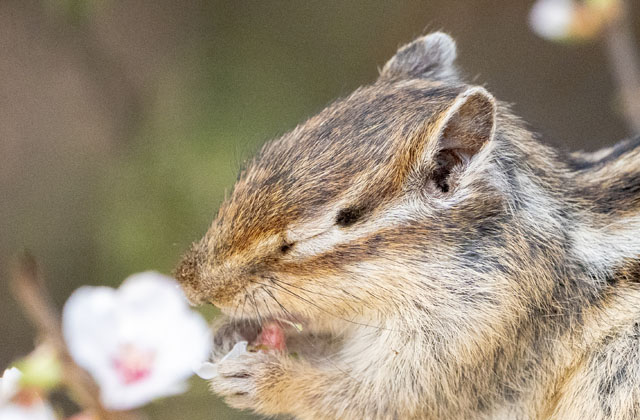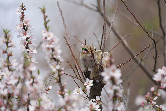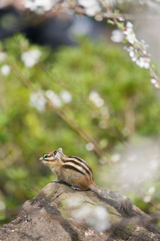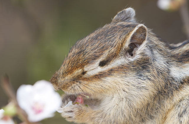 「りすの家」の中に桜の花は咲いていないのですが、それっぽく見える「ユスラウメ」があちこちに植えられていて、この花をシマリスたちが食べに来てくれます。
