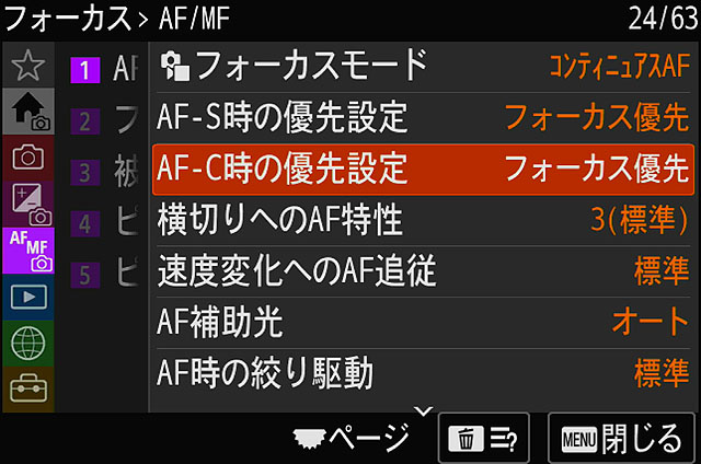そして、これも重要。フォーカスの優先設定で、レリーズ優先なのか、フォーカス優先なのか選べます。どんなにいい瞬間を撮ってもフォーカスがあっていなかったら使い物になりませんので。ここはフォーカス優先に設定します。