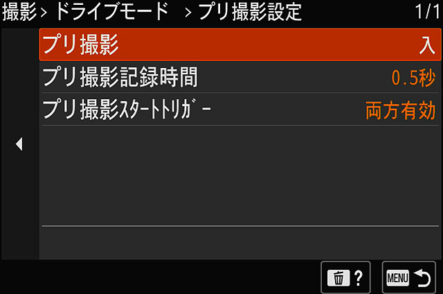 そして、カスタムキー設定でレンズのフォーカスロックボタンあたりに「ドライブモード切替」を設定しておきます。こうするとレンズのわきについているボタンを押せば単写と連写が切り替わり、プリ撮影も同時に設定されます。