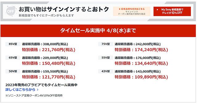 なお、ソニーストアではMy Sony IDをお持ちのかたでしたら「AV商品10%オフクーポン」を利用して表示価格から10%オフにして購入できるのと、ラッキー抽選会に参加することで最大10万円のお買い物券がもらえるキャンペーンも利用ができます。ラッキー抽選会で5,000円クーポンが当選した場合の価格も参考として掲載しました。