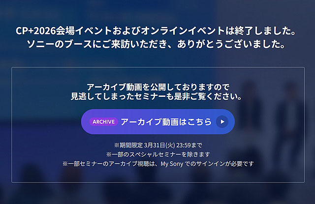 そして、CP+2026のソニーのイベントサイトには、スペシャルセミナーのアーカイブ動画が見られるようになっているのですが、こちらも期間限定になっていて3月31日23時59分までとなっています。