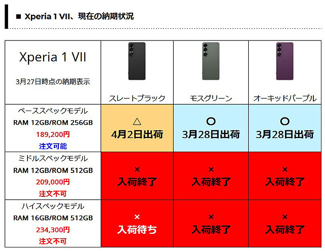 今回のXperia 1 VIIも現在の納期状況はこんなことになっています。