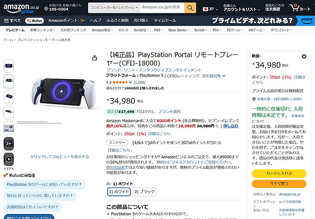 現在、AmazonではPS Portalの在庫が復活しており、旧価格での注文が可能になっています。ブラックは納期表示がある状態で、ホワイトは納期未定となっています。