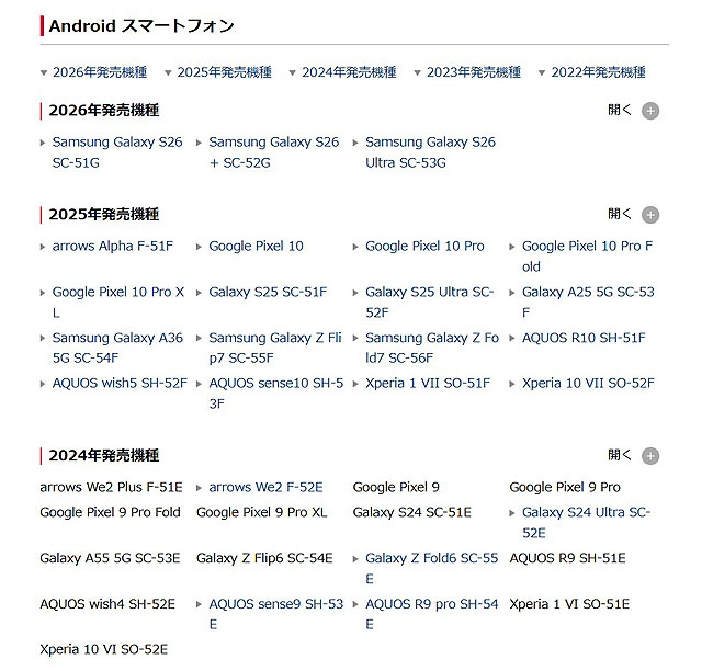 上記はドコモで販売したモデルを対象にした機種で、ソニーの「Xperia 1 VII SO-51F」「Xperia 10 VII SO-52F」が含まれていて、2024年モデルの「Xperia 1 VI」「Xperia 10 VI」までが掲載されていました。
