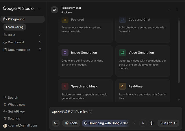 「Google AI Studio」はソフトウェアではなく、Webアプリなので、ブラウザ上で使えます。サイトにアクセスして一番下にプロンプト入力欄があるので、そこに「Xperia沼診断アプリを作って」と入れてみます。