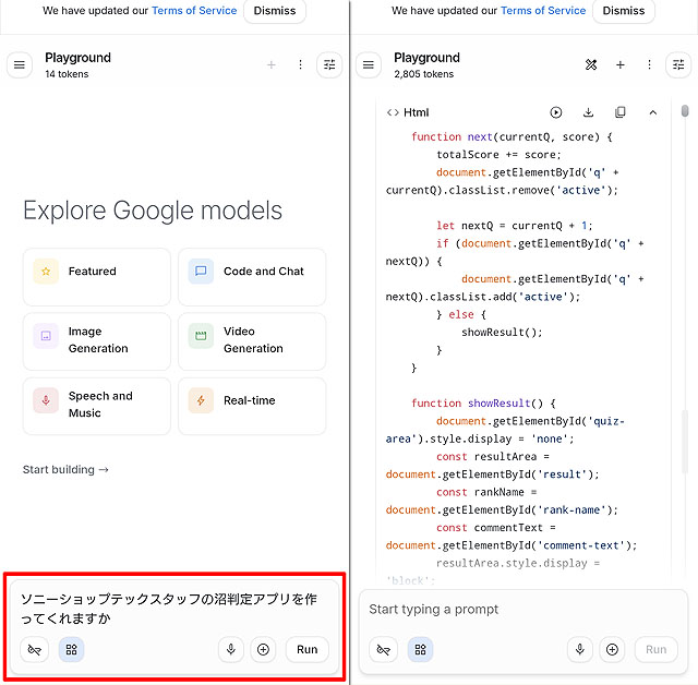 ここでは「ソニーショップテックスタッフの沼判定アプリを作ってくれますか?」と入力すると、その場でコードが一気に生成されます。
