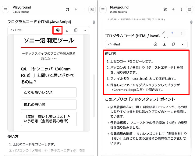 コードの出力が終わったら画面右上の方に再生ボタンがあるので、それをタップすると作られたミニアプリが動作します。これで内容を確認すると、HTMLコードが書き出されているので、これをコピペして「.html」という拡張子のテキストファイルを作れば、プログラム完成です。